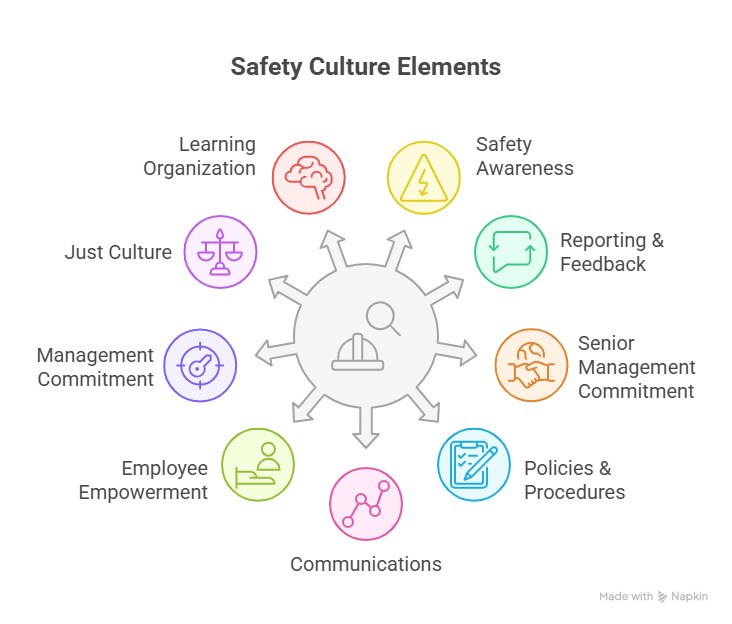 A comprehensive assessment of safety culture requires examining nine interconnected elements that collectively determine how effectively your safety management system functions in practice. This framework provides a structured approach to identifying and addressing cultural gaps.